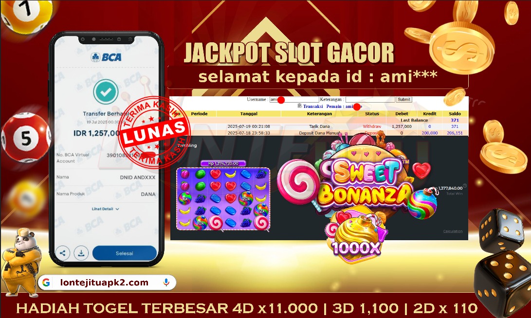 Bukti JP SLOT Sweet Bonanza1000 – Kami mengucapkan selamat kepada bossku Username ID AMI*** atas kemenangan di permainan SLOT Sweet Bonanza1000 dengan total kemenangan sebesar Rp.1,257000,00,- Kemenangan ini yang pastinya sudah dibayar LUNAS sesuai dengan bukti ya bossku. Lontejitu nih boss, berapapun kemenangan anda akan tetap kami bayar sampai tuntas ya boss.
