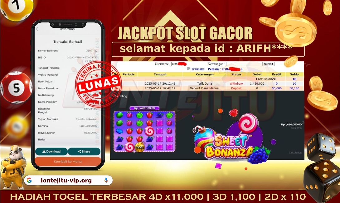 Bukti JP SLOT SWEET BONANZA 1000 – Kami mengucapkan selamat kepada bossku Username ID ARIFH*** atas kemenangan di permainan SLOT SWEET BONANZA 1000 dengan total kemenangan sebesar Rp.1,450.000,00,- Kemenangan ini yang pastinya sudah dibayar LUNAS sesuai dengan bukti ya bossku. Lontejitu nih boss, berapapun kemenangan anda akan tetap kami bayar sampai tuntas ya boss.