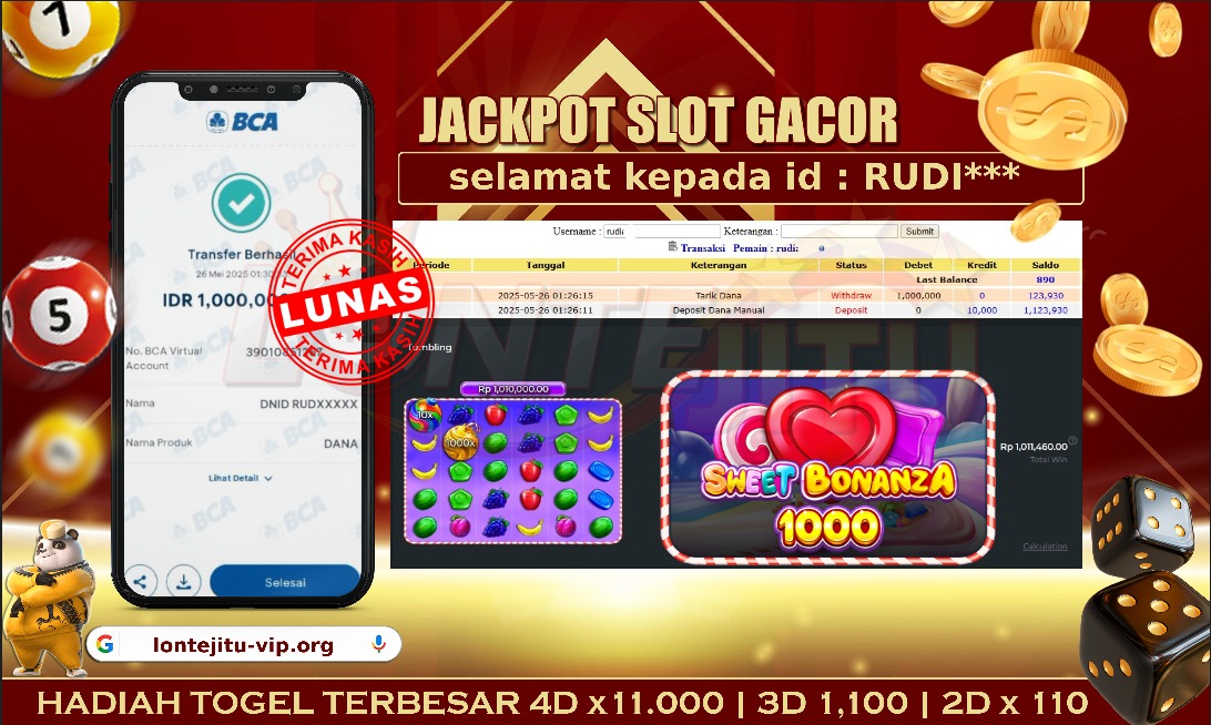 Bukti JP SLOT SWEET BONANZA 1000 – Kami mengucapkan selamat kepada bossku Username ID RUDI*** atas kemenangan di permainan SLOT SWEET BONANZA 1000 dengan total kemenangan sebesar Rp.1,000.000,00,- Kemenangan ini yang pastinya sudah dibayar LUNAS sesuai dengan bukti ya bossku. Lontejitu nih boss, berapapun kemenangan anda akan tetap kami bayar sampai tuntas ya boss.