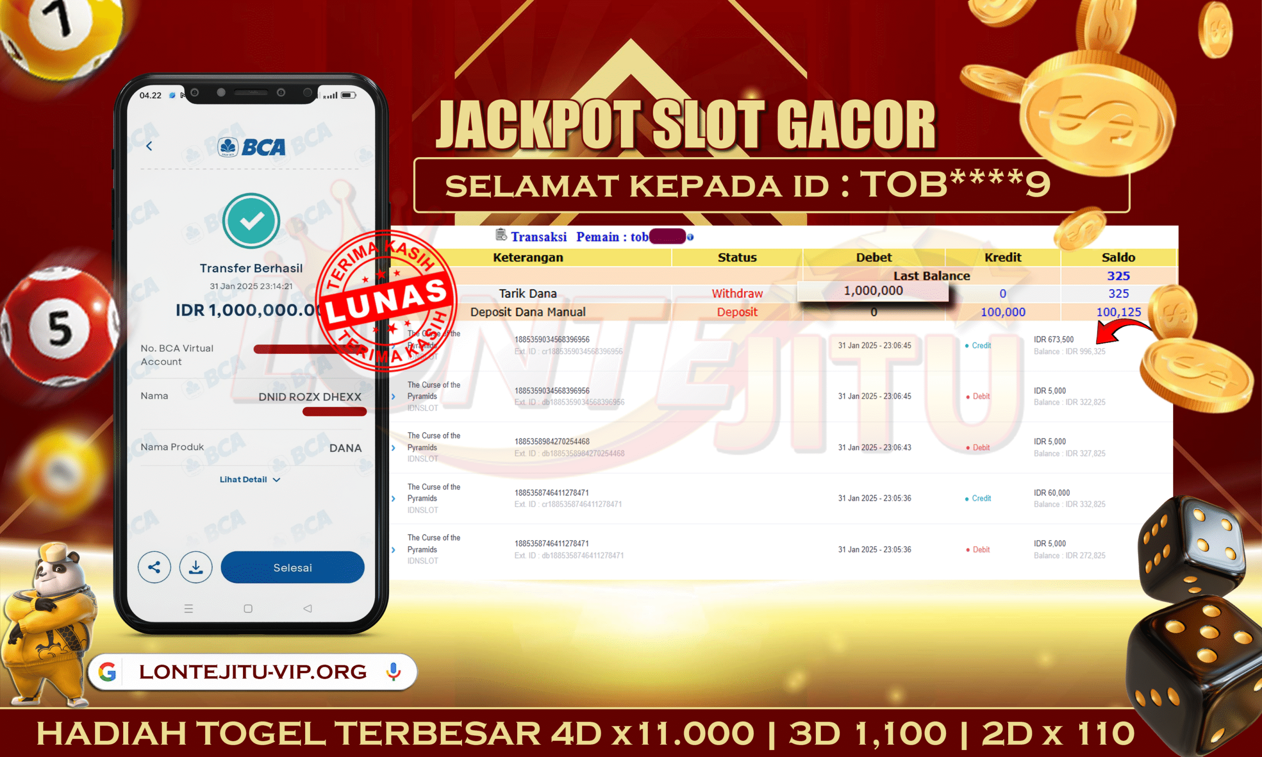 Bukti JP SLOT THE CURSE OF PYRAMIDS – Kami mengucapkan selamat kepada bossku Username ID TOB****9 atas kemenangan di permainan SLOT THE CURSE OF PYRAMIDS dengan total kemenangan sebesar Rp. 1,000.000,00,- Kemenangan ini yang pastinya sudah dibayar LUNAS sesuai dengan bukti ya bossku. Lontejitu nih boss, berapapun kemenangan anda akan tetap kami bayar sampai tuntas ya boss.