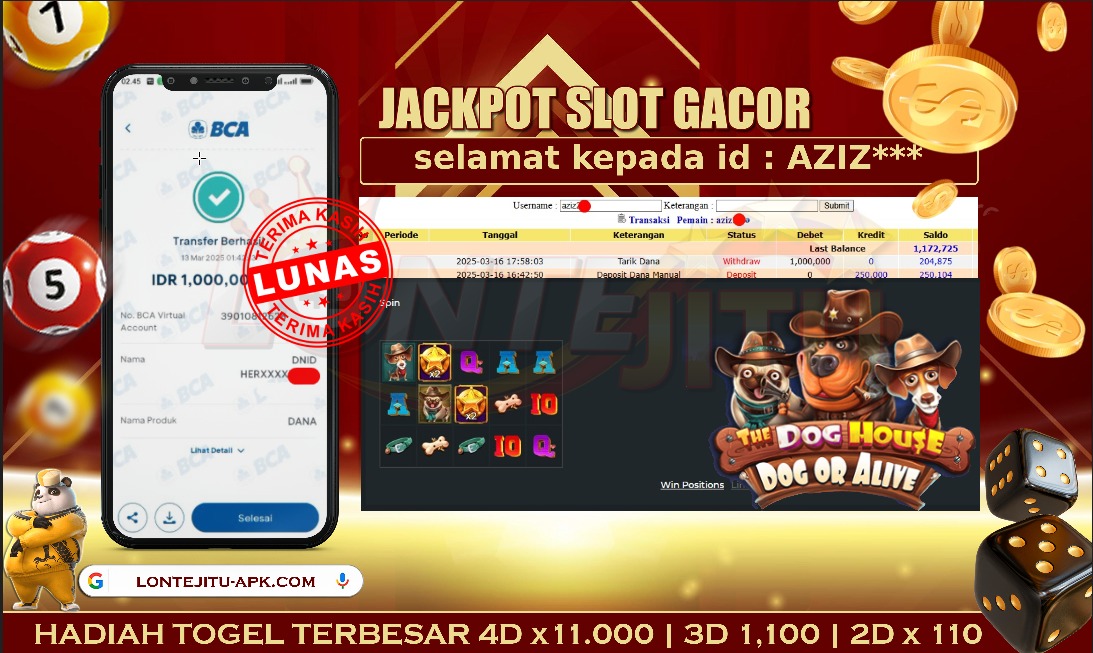 Bukti JP SLOT THE DOG HOUSE DOG OR ALIVE – Kami mengucapkan Selamat kepada bossku dengan Username ID AZIZ*** atas kemenangannya di permainan SLOT THE DOG HOUSE DOG OR ALIVE dengan total kemenangan sebesar Rp.1.000.000,00,- Kemenangan ini yang pastinya sudah dibayar LUNAS sesuai dengan bukti ya bossku. Lontejitu nih boss, berapapun kemenangan anda akan tetap kami bayar sampai tuntas ya boss.