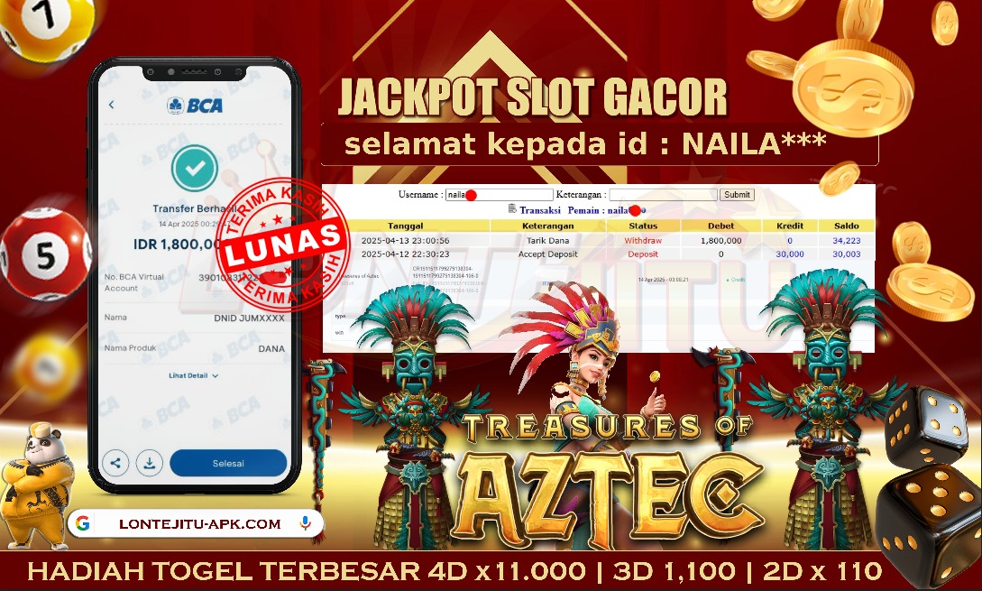 Bukti JP SLOT TREASURES OF AZTEC – Namun, yang kami posting ini sah dan real tanpa merekayasa yah dan hanya bertujuan untuk meningkatkan kepercayaan para member kami dan memberikan kenyamanan saat melakukan taruhan di situs kami, Jadi bosku tidak perlu khawatir  BERAPAPUN KEMENANGAN KALIAN PASTI DIBAYAR LUNAS !!  . Teman – teman sekalian sudah daftar di  LONTEJITU  belum yah..?, Jika belum jangan tunggu lagi, ayo segera daftarkan dan mainkan game  SLOT GACOR  kami yang sedang  ONFIRE  ini bisa jadi saudara / saudara salahsatu orang beruntung yang akan  JP PAUS  berikutnya nih!!.