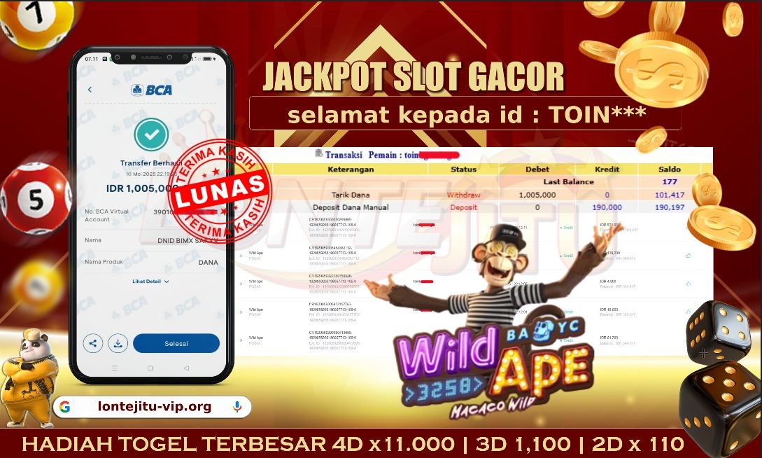 Bukti JP– Kami mengucapkan selamat kepada bossku Username ID TOIN*** atas kemenangan di permainan SLOT WILD APE dengan total kemenangan sebesar Rp.1,005.000,00,- Kemenangan ini yang pastinya sudah dibayar LUNAS sesuai dengan bukti ya bossku. Lontejitu nih boss, berapapun kemenangan anda akan tetap kami bayar sampai tuntas ya boss.