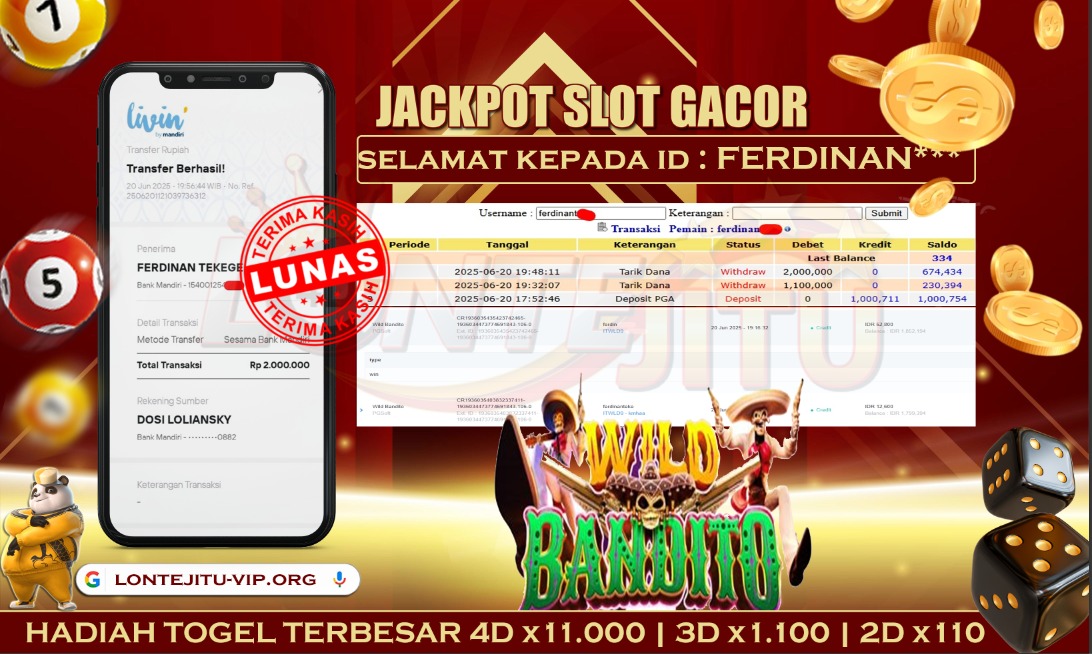 Bukti JP SLOT WILD BANDITO – Namun, yang kami posting ini sah dan real tanpa merekayasa yah dan hanya bertujuan untuk meningkatkan kepercayaan para member kami dan memberikan kenyamanan saat melakukan taruhan di situs kami, Jadi bosku tidak perlu khawatir BERAPAPUN KEMENANGAN KALIAN PASTI DIBAYAR LUNAS !! . Teman – teman sekalian sudah daftar di LONTEJITU belum yah..?, Jika belum jangan tunggu lagi, ayo segera daftarkan dan mainkan game SLOT GACOR kami yang sedang ONFIRE ini bisa jadi saudara / saudara salahsatu orang beruntung yang akan JP PAUS berikutnya nih!!.