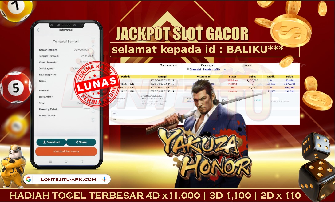 Bukti JP SLOT Yakuza Honor – Namun, yang kami posting ini sah dan real tanpa merekayasa yah dan hanya bertujuan untuk meningkatkan kepercayaan para member kami dan memberikan kenyamanan saat melakukan taruhan di situs kami, Jadi bosku tidak perlu khawatir BERAPAPUN KEMENANGAN KALIAN PASTI DIBAYAR LUNAS !!!. Teman – teman sekalian sudah daftar di LONTEJITU belum yah..?, Jika belum tunggu apa lagi, ayo segera daftarkan dan mainkan game SLOT GACOR kami yang sedang ONFIRE ini bisa jadi saudara / saudara salah satu orang beruntung yang akan JP PAUS berikutnya nih!.