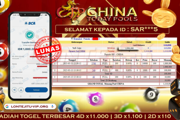 Bukti JP TOGEL CHINA POOLS – Kami mengucapkan selamat kepada bossku Username ID SAR***5 atas kemenangan di permainan TOGEL CHINA POOLS dengan total kemenangan sebesar Rp. 1,000.000,00,- Kemenangan ini yang pastinya sudah dibayar LUNAS sesuai dengan bukti ya bossku. Lontejitu nih boss, berapapun kemenangan anda akan tetap kami bayar sampai tuntas ya boss.  Disini kami mengucapkan Terimakasih telah…