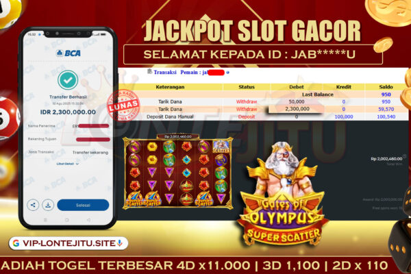 Bukti JP SLOT GATES OF OLYMPUS SUPER SCATTER – Kami mengucapkan selamat kepada bossku Username ID JAB*****U atas kemenangan di permainan SLOT GATES OF OLYMPUS SUPER SCATTER dengan total kemenangan sebesar Rp.1,000.000,00,- Kemenangan ini yang pastinya sudah dibayar LUNAS sesuai dengan bukti ya bossku. Lontejitu nih boss, berapapun kemenangan anda akan tetap kami bayar sampai tuntas ya boss. …