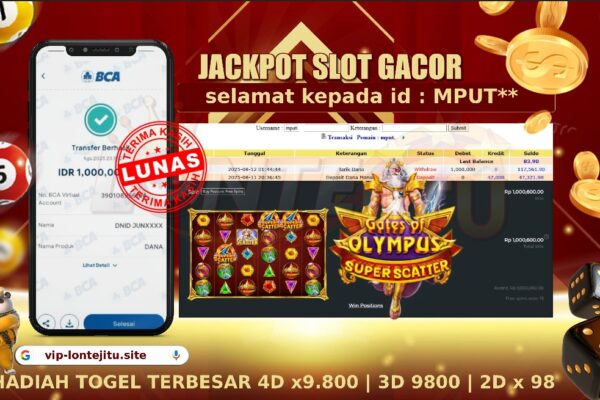 Bukti JP SLOT GATES OF OLYMPUS SUPER SCATTER – Kami mengucapkan selamat kepada bossku Username ID MPUT** atas kemenangan di permainan SLOT GATES OF OLYMPUS SUPER SCATTER dengan total kemenangan sebesar Rp.1,000.000,00,- Kemenangan ini yang pastinya sudah dibayar LUNAS sesuai dengan bukti ya bossku. Lontejitu nih boss, berapapun kemenangan anda akan tetap kami bayar sampai tuntas ya boss. …