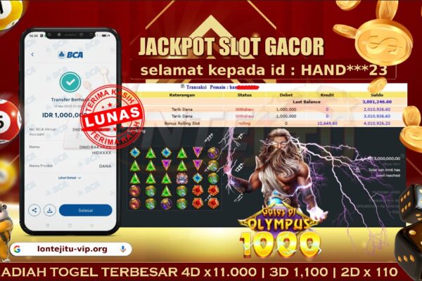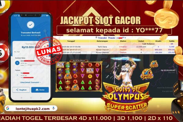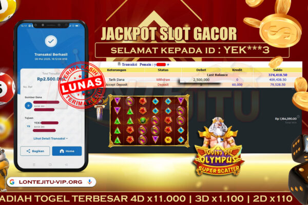 Bukti JP SLOT GATES OF OLYMPUS SUPER SCATTER – Kami mengucapkan selamat kepada bossku Username ID GAD***08 atas kemenangan di permainan SLOT GATES OF OLYMPUS SUPER SCATTER dengan total kemenangan sebesar Rp.2,500.000,00,- Kemenangan ini yang pastinya sudah dibayar LUNAS sesuai dengan bukti ya bossku. Lontejitu nih boss, berapapun kemenangan anda akan tetap kami bayar sampai tuntas ya boss. …