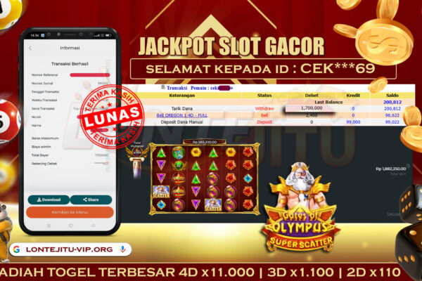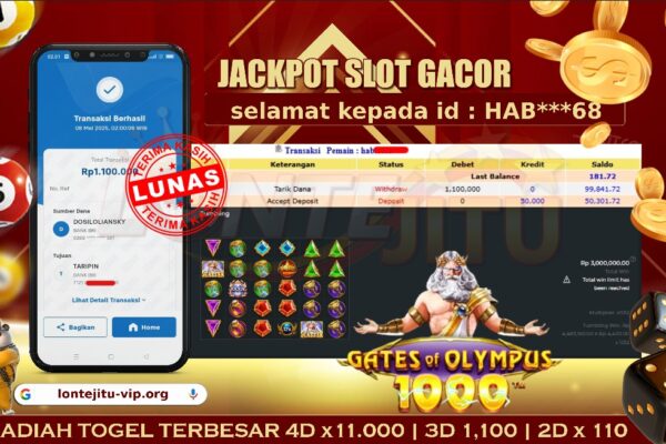 Bukti JP SLOT GATES OF OLYMPUS 1000 – Kami mengucapkan Selamat kepada bossku dengan Username ID HAB***68atas kemenangannya di permainan SLOT GATES OF OLYMPUS 1000 dengan total kemenangan sebesar Rp.1,100.000,00,- Kemenangan ini yang pastinya sudah dibayar LUNAS sesuai dengan bukti ya bossku. Lontejitu nih boss, berapapun kemenangan anda akan tetap kami bayar sampai tuntas ya boss. Disini…