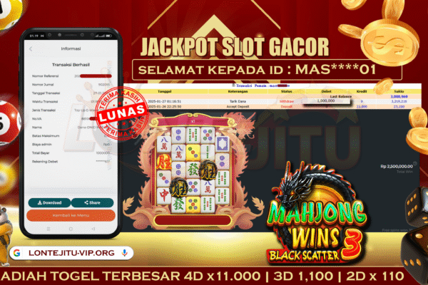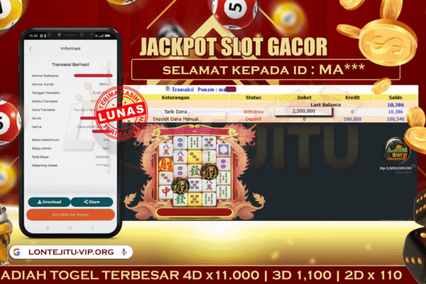 Bukti JP– Kami mengucapkan selamat kepada bossku Username ID DEGO*** atas kemenangan di permainan SLOT MAHJONG WINS 3 dengan total kemenangan sebesar Rp.1,000.000,00,- Kemenangan ini yang pastinya sudah dibayar LUNAS sesuai dengan bukti ya bossku. Lontejitu nih boss, berapapun kemenangan anda akan tetap kami bayar sampai tuntas ya boss. Disini kami mengucapkan Terimakasih telah mempercayakan LONTEJITU…