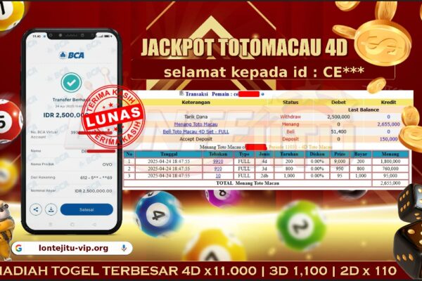 Bukti JP TOGEL TOTOMACAU 4D – Kami mengucapkan Selamat kepada bossku dengan Username ID PIP*** atas kemenangannya di permainan TOGEL TOTOMACAU 4D dengan total kemenangan sebesar Rp.2.000.000,00,- Kemenangan ini yang pastinya sudah dibayar LUNAS sesuai dengan bukti ya bossku. Lontejitu nih boss, berapapun kemenangan anda akan tetap kami bayar sampai tuntas ya boss. Disini kami mengucapkan Terimakasih kepada…