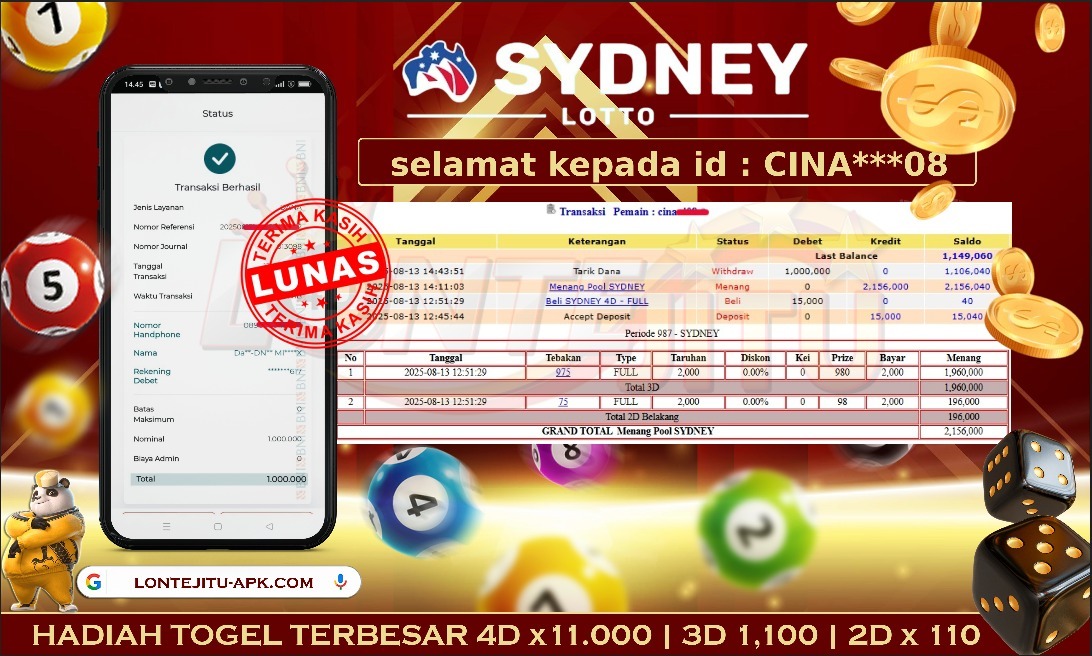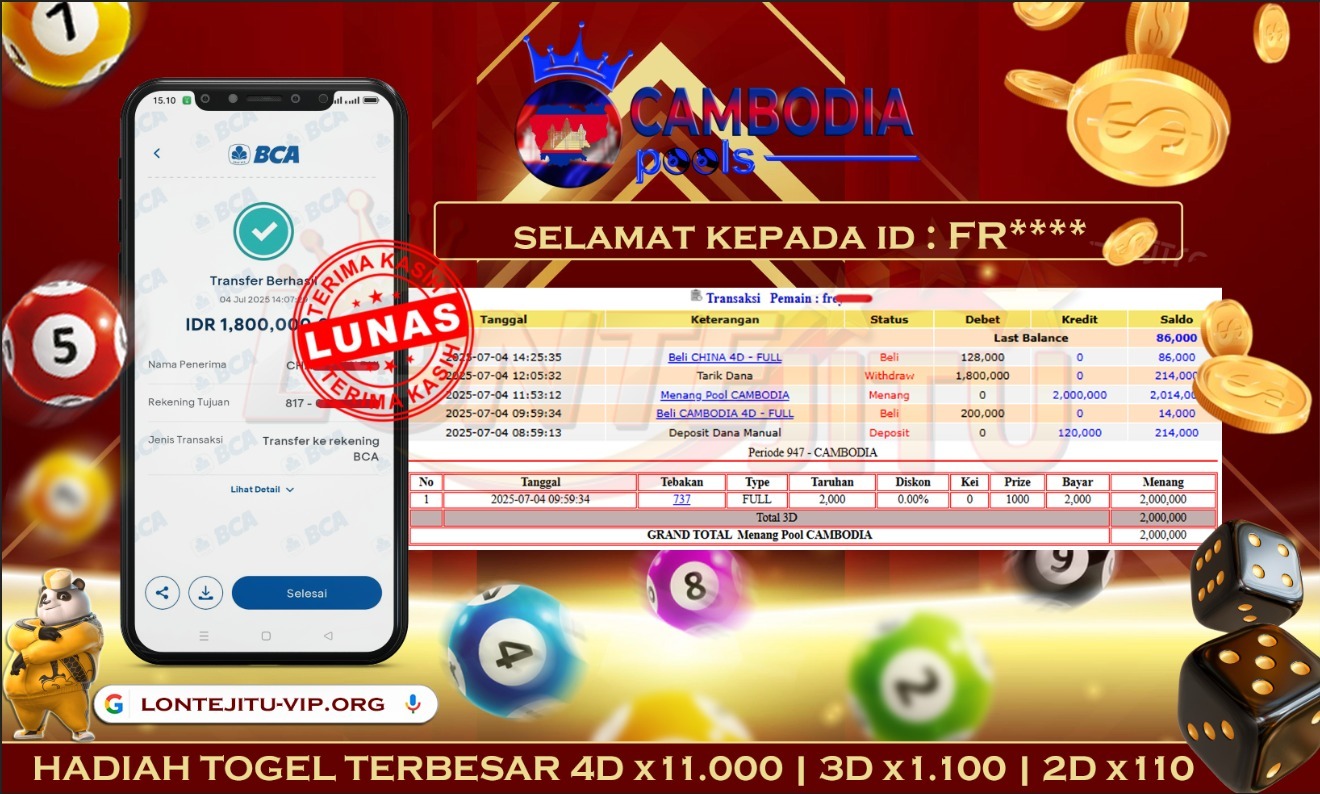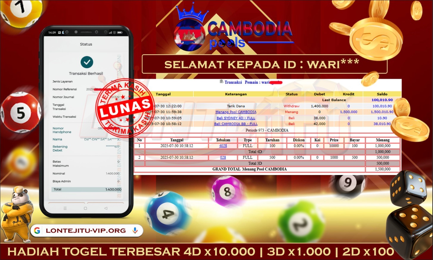 Bukti JP TOGEL CAMBODIA POOLS – Kami mengucapkan selamat kepada bossku Username ID WARI*** atas kemenangan di permainan TOGEL CAMBODIA POOLS dengan total kemenangan sebesar Rp. 1.400.000,00,- Kemenangan ini yang pastinya sudah dibayar LUNAS sesuai dengan bukti ya bossku. Lontejitu nih boss, berapapun kemenangan anda akan tetap kami bayar sampai tuntas ya boss.