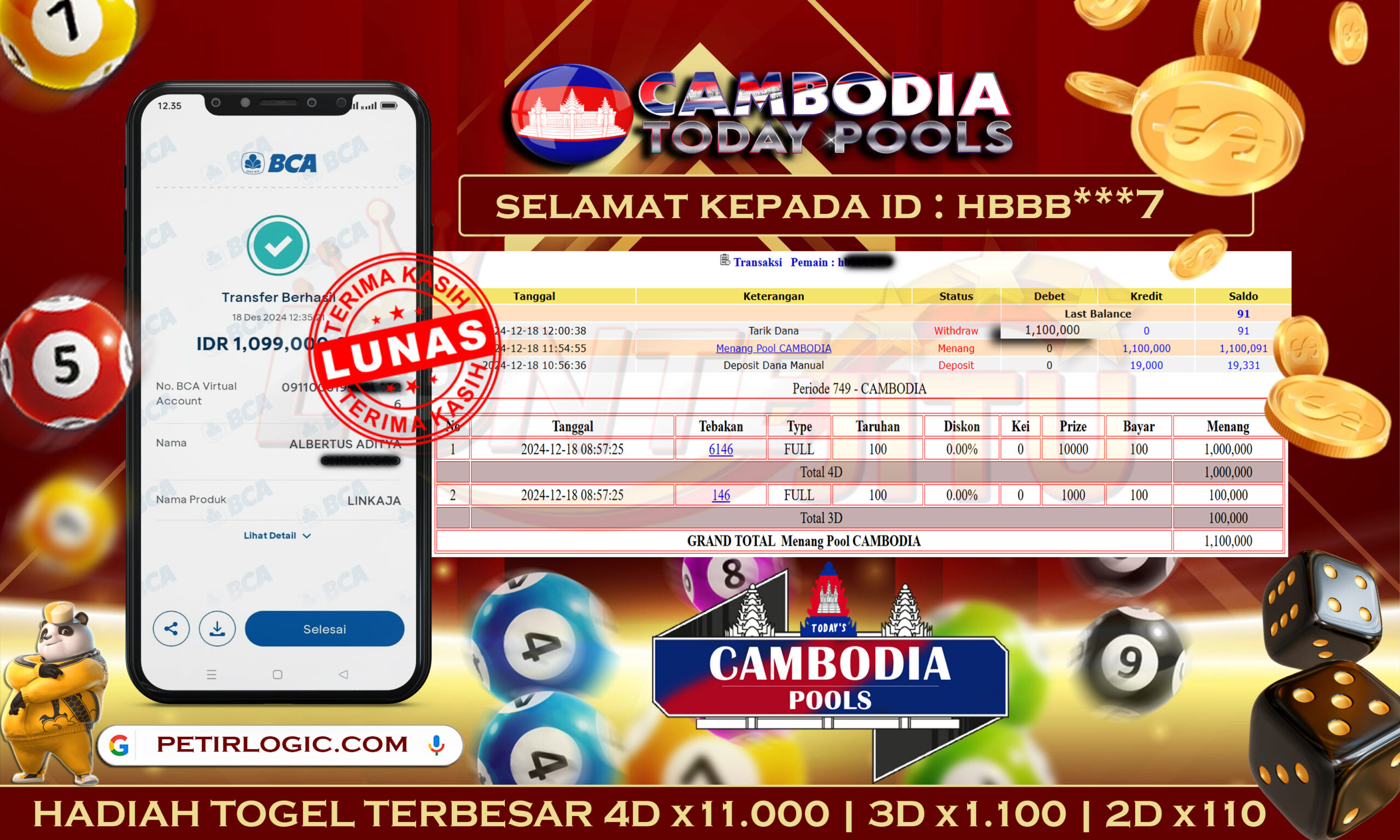 Bukti JP TOGEL CAMBODIA POOLS – Kami mengucapkan selamat kepada bossku Username ID HBBB***7 atas kemenangan di permainan TOGEL CAMBODIA POOLS dengan total kemenangan sebesar Rp. 1.100.000,00,- Kemenangan ini yang pastinya sudah dibayar LUNAS sesuai dengan bukti ya bossku. Lontejitu nih boss, berapapun kemenangan anda akan tetap kami bayar sampai tuntas ya boss.