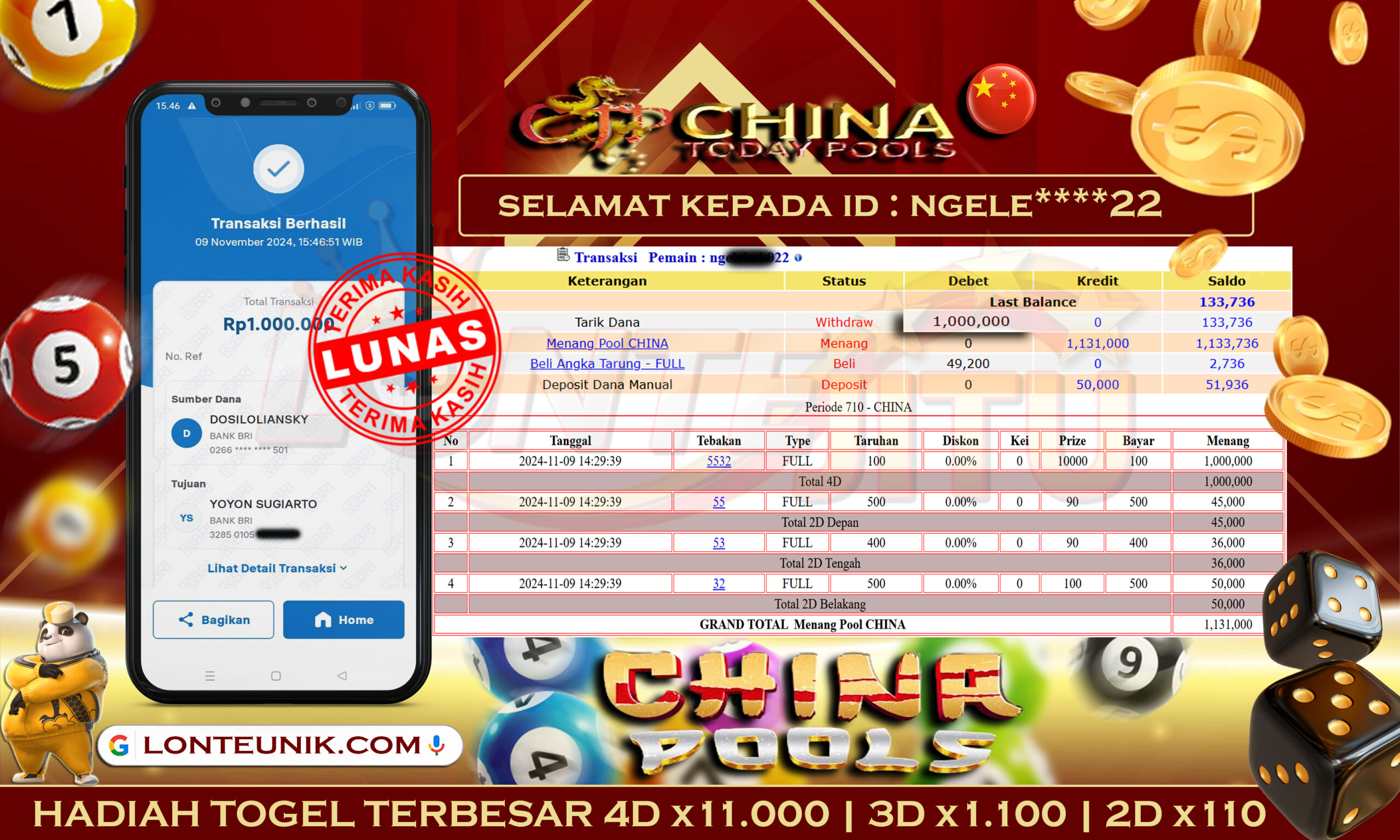 Bukti JP TOGEL CHINA POOLS – Kami mengucapkan selamat kepada bossku Username ID NGELE****22 atas kemenangan di permainan TOGEL CHINA POOLS dengan total kemenangan sebesar Rp. 1.131.000,00,- Kemenangan ini yang pastinya sudah dibayar LUNAS sesuai dengan bukti ya bossku. Lontejitu nih boss, berapapun kemenangan anda akan tetap kami bayar sampai tuntas ya boss.