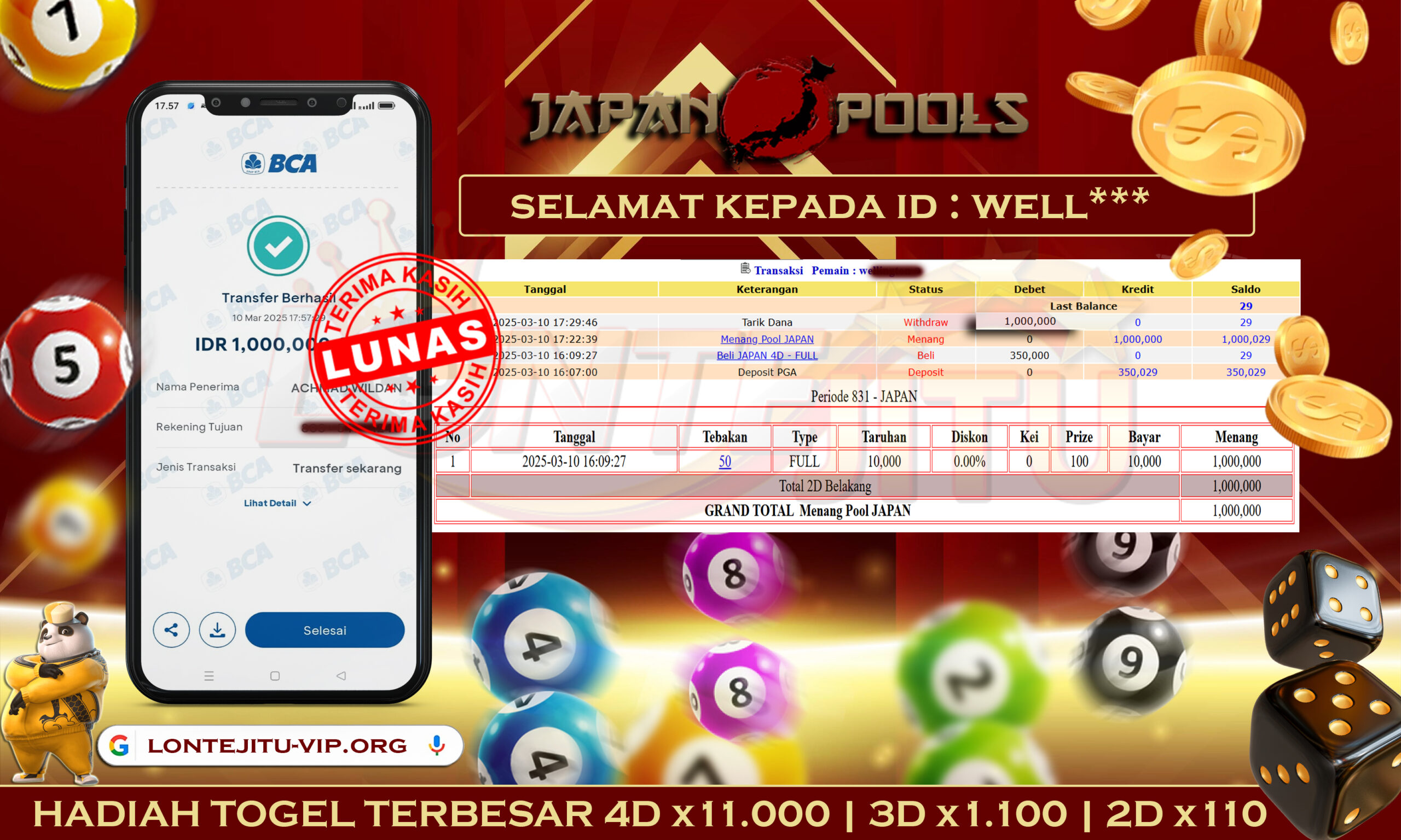 Bukti JP TOGEL JAPAN POOLS – Kami mengucapkan Selamat kepada bossku dengan Username ID WELL*** atas kemenangannya di permainan TOGEL JAPAN POOLS dengan total kemenangan sebesar Rp.1.000.000,00,- Kemenangan ini yang pastinya sudah dibayar LUNAS sesuai dengan bukti ya bossku. Lontejitu nih boss, berapapun kemenangan anda akan tetap kami bayar sampai tuntas ya boss.
