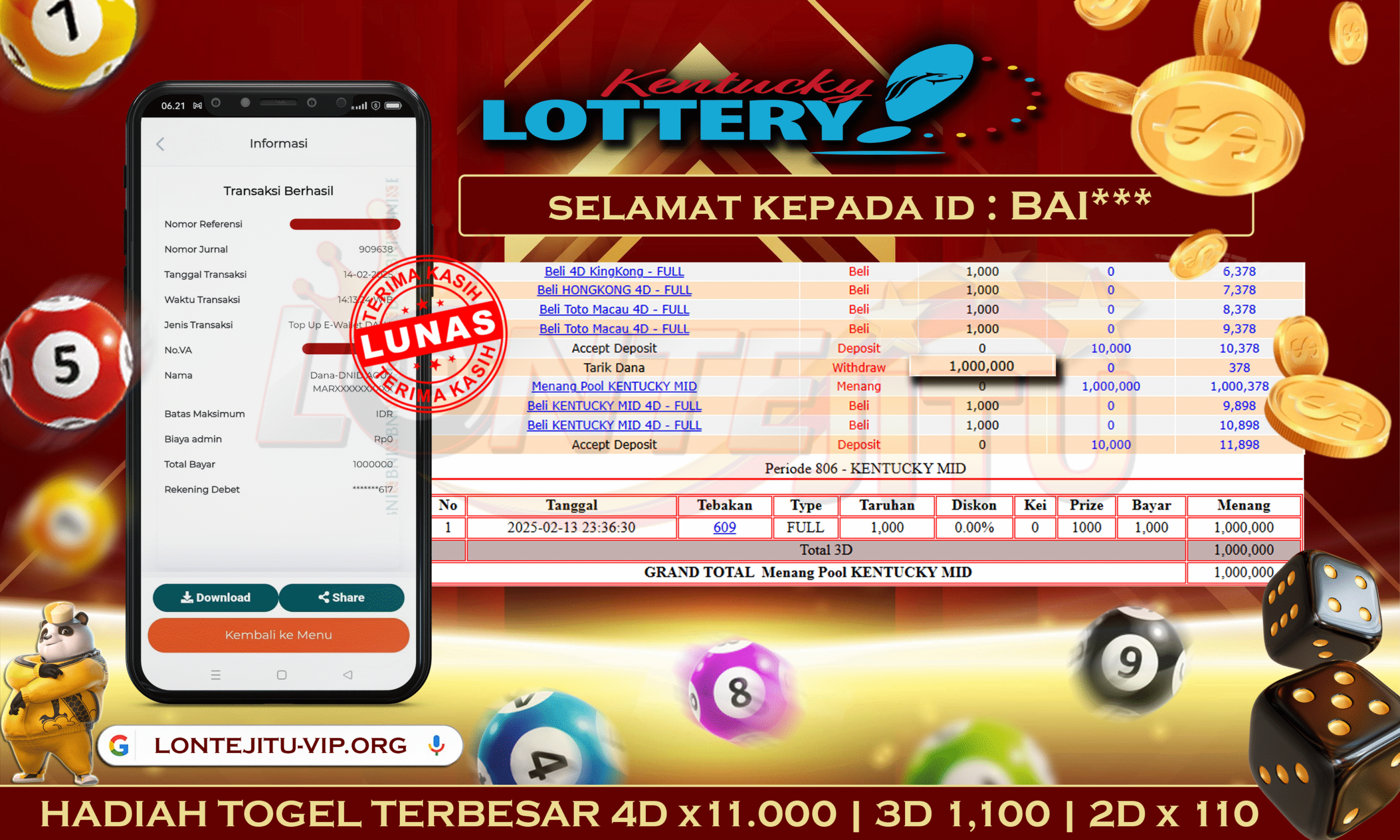 Bukti JP TOGEL KENTUCKY MIDDAY – Kami mengucapkan selamat kepada bossku Username ID BAI*** atas kemenangan di permainan TOGEL KENTUCKY MIDDAY dengan total kemenangan sebesar Rp. 1.000.000,00,- Kemenangan ini yang pastinya sudah dibayar LUNAS sesuai dengan bukti ya bossku. Lontejitu nih boss, berapapun kemenangan anda akan tetap kami bayar sampai tuntas ya boss.