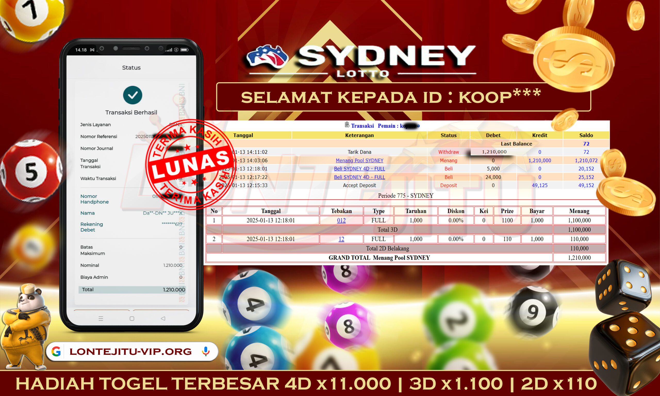 Bukti JP TOGEL SYDNEY LOTTO – Kami mengucapkan selamat kepada bossku Username ID KOOP*** atas kemenangan di permainan TOGEL SYDNEY LOTTOÂ dengan total kemenangan sebesar Rp. 1.210.000,00,- Kemenangan ini yang pastinya sudah dibayar LUNAS sesuai dengan bukti ya bossku. Lontejitu nih boss, berapapun kemenangan anda akan tetap kami bayar sampai tuntas ya boss.Â