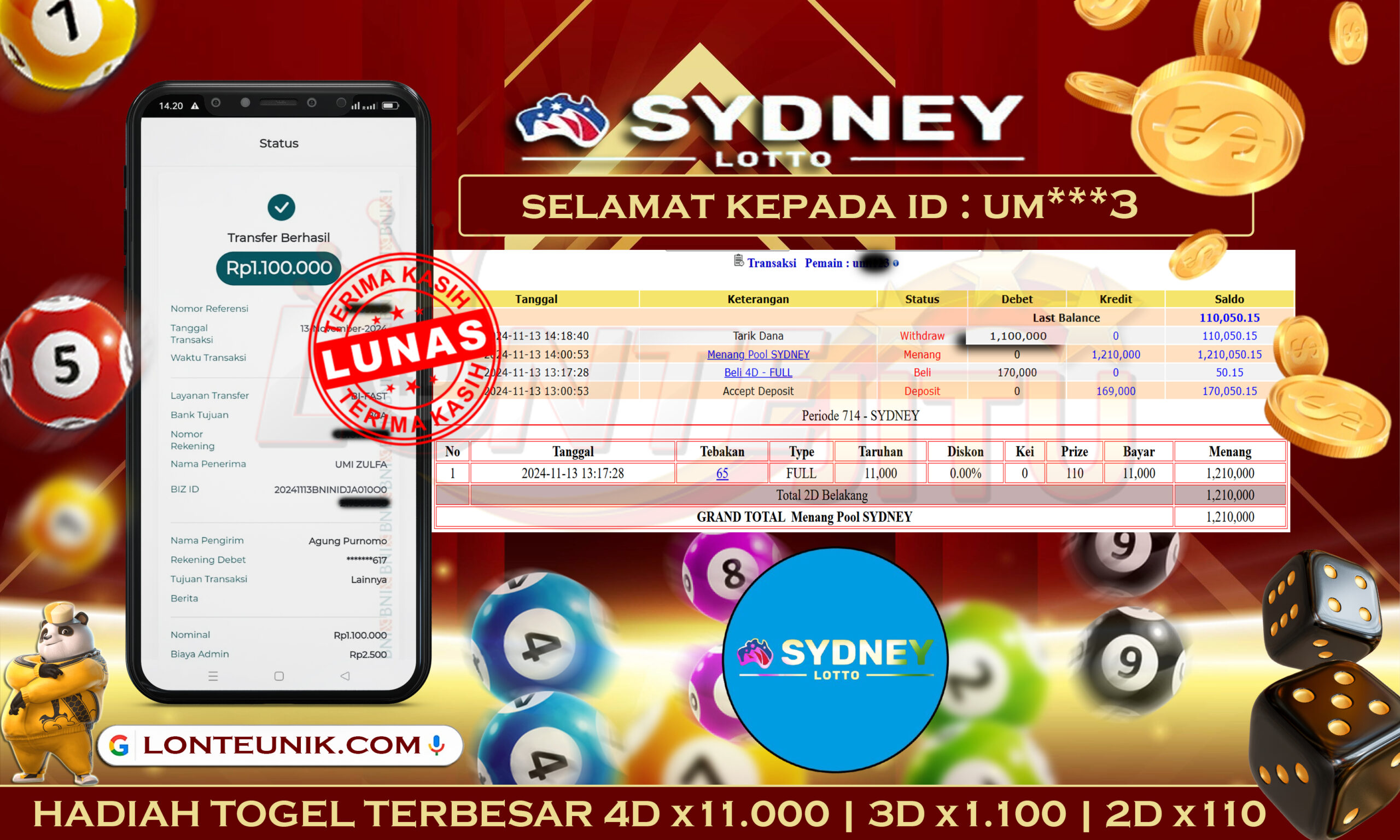 Bukti JP TOGEL SYDNEY LOTTO – Kami mengucapkan selamat kepada bossku Username ID UM***3 atas kemenangan di permainan TOGEL SYDNEY LOTTO dengan total kemenangan sebesar Rp. 1.210.000,00,- Kemenangan ini yang pastinya sudah dibayar LUNAS sesuai dengan bukti ya bossku. Lontejitu nih boss, berapapun kemenangan anda akan tetap kami bayar sampai tuntas ya boss.