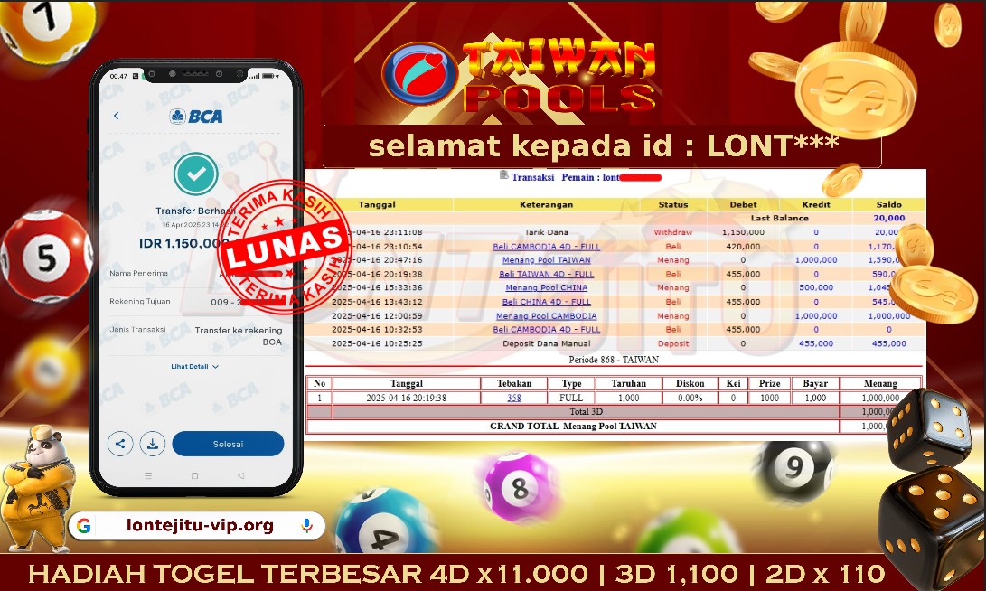 Bukti JP TOGEL TAIWAN POOLS – Kami mengucapkan selamat kepada bossku Username ID LONT**** atas kemenangan di permainan TOGEL TAIWAN POOLS dengan total kemenangan sebesar Rp. 1.150.000,00,- Kemenangan ini yang pastinya sudah dibayar LUNAS sesuai dengan bukti ya bossku. Lontejitu nih boss, berapapun kemenangan anda akan tetap kami bayar sampai tuntas ya boss.