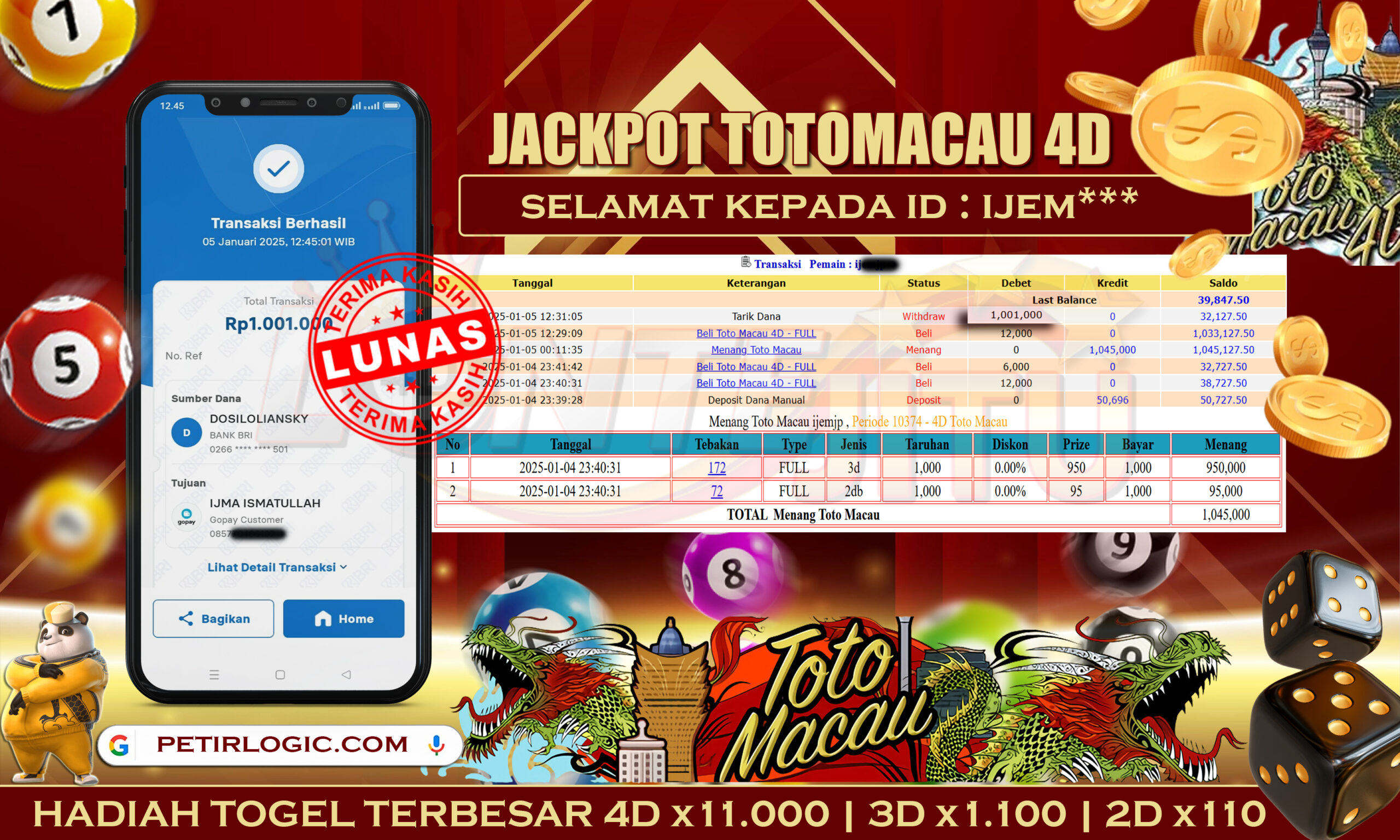 Bukti JP TOGEL TOTOMACAU 4D – Kami mengucapkan selamat kepada bossku Username ID IJEM*** atas kemenangan di permainan TOGEL TOTOMACAU 4D dengan total kemenangan sebesar Rp. 1.045.000,00,- Kemenangan ini yang pastinya sudah dibayar LUNAS sesuai dengan bukti ya bossku. Lontejitu nih boss, berapapun kemenangan anda akan tetap kami bayar sampai tuntas ya boss.