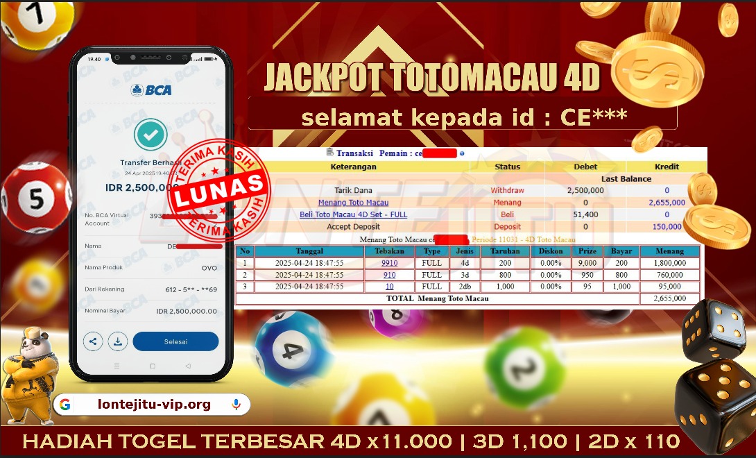 Bukti JP TOGEL TOTOMACAU 4D – Kami mengucapkan Selamat kepada bossku dengan Username ID CE**** atas kemenangannya di permainan TOGEL TOTOMACAU 4D dengan total kemenangan sebesar Rp.2.500.000,00,- Kemenangan ini yang pastinya sudah dibayar LUNAS sesuai dengan bukti ya bossku. Lontejitu nih boss, berapapun kemenangan anda akan tetap kami bayar sampai tuntas ya boss.